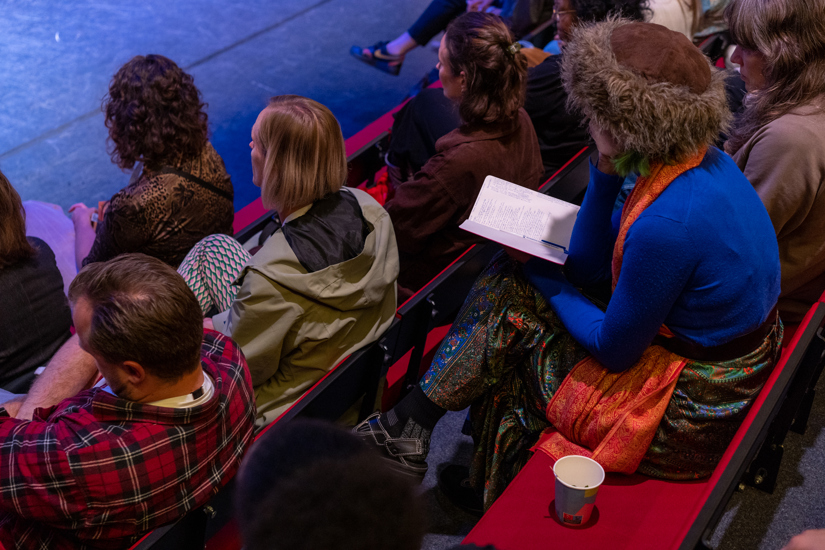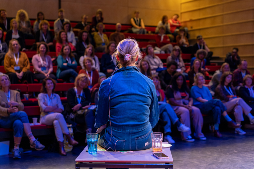 Theatermaker en action-writer Laura van Dolron schrijft tijdens het gesprek live een reflectie die ze ook voordraagt. Haar uitsmijter beschrijft prachtig waar het eigenlijk om draait. “Dan blijven die volwassenen toch lekker op hun telefoons kijken, wat ze toch de hele tijd doen, dan gaan de kinderen maar alleen naar het theater. En degene die het onveilige bespreekt, maakt niet de onveiligheid. En als ze dat gaan verwarren, raken ze zo ongelooflijk veel kwijt. En kinderen snappen dat. Ze snappen zoveel meer. Ze kunnen zoveel aan. Dus laat ze ons dingen leren, in plaats van andersom.”