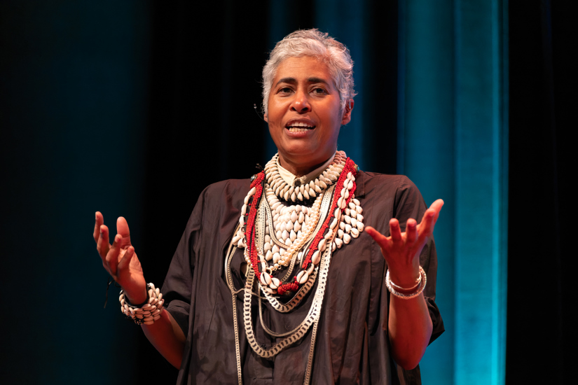 Dagvoorzitter Shantie Singh opent de middag met een persoonlijke noot over haar Surinaams Hindoestaanse achtergrond. “(…) Door mijn geschiedenis heb ik me lang een wandelend mysterie gevoeld. Telkens kreeg ik de vraag die velen van jullie hier waarschijnlijk wel kennen: ‘Waar kom je écht vandaan?’ En steeds moest ik uitleggen dat ik hier geboren ben, in Nederland.” Singh’s voorouders waren contractarbeiders die vanuit India naar Suriname werden verscheept om na de afschaffing van slavernij de zware arbeid op plantages te verrichten.